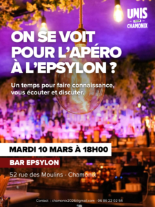 Ce mardi 10 mars à 18h00, on vous donne rendez-vous pour un apéritif convivial au bar Epsylon. Au programme : une discussion simple et chaleureuse