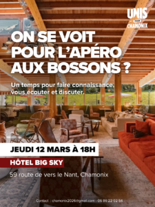 Ce jeudi 12 mars à 18h00, on vous donne rendez-vous pour un apéritif convivial à l’hôtel Big Sky aux Bossons. Au programme : une discussion