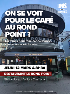 Ce jeudi 12 mars à 8h30, on vous donne rendez-vous pour un café convivial au restaurant le Rond Point en centre-ville de Chamonix. Au programme