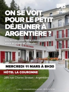 Ce mercredi 11 mars à 8h30, on vous donne rendez-vous pour un petit-déjeuner convivial à l’hôtel de la Couronne à Argentière. Au programme : café,